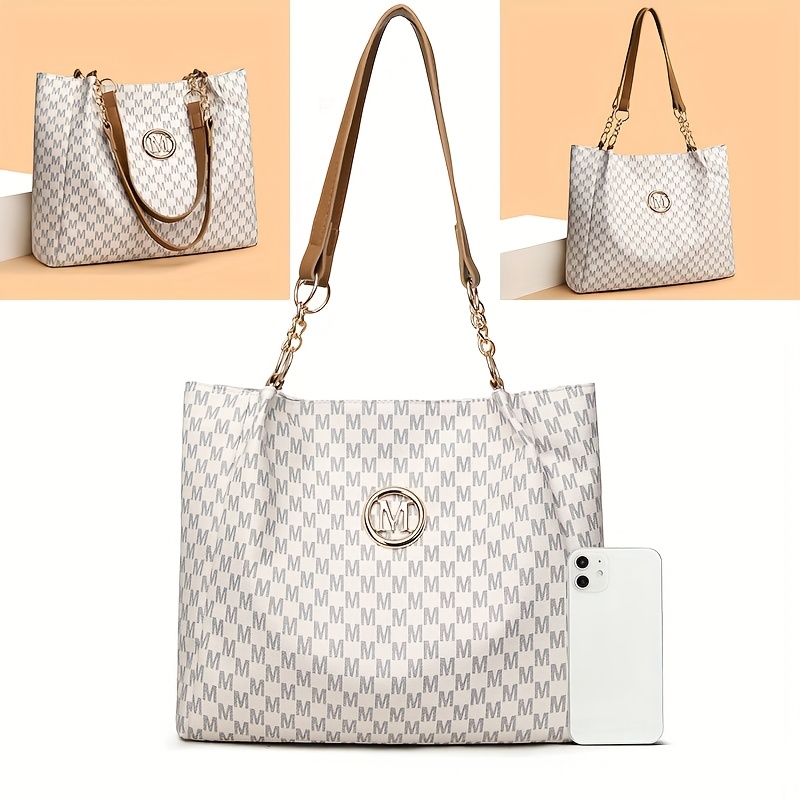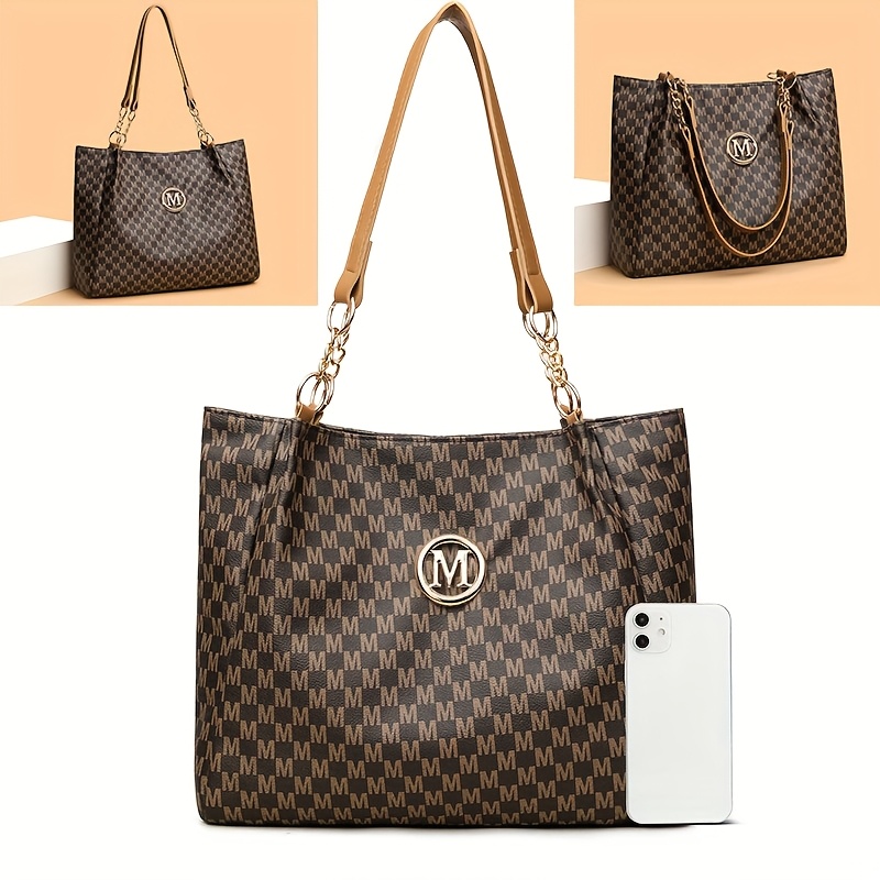 Introducing the Elegant Women's Tote Bag, a perfect blend of sophistication and practicality. This stylish tote features a golden-tone chain strap that adds a touch of glamour to your everyday look. The bag is adorned with a chic letter "M" emblem, making it a standout accessory for any outfit. Crafted from high-quality synthetic leather, it offers durability and a luxurious feel. The light brown, white, and black houndstooth pattern gives it a timeless appeal, ensuring it remains a fashionable choice season after season.